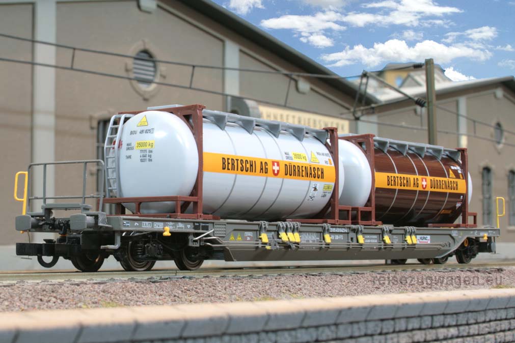 4-achsiger Tragwagen der “Hupacâ€, beladen mit 2 “Bertschi”-Wechselbehälter und einem MAN TG-A LX mit Wechselpritsche. Mischbauweise aus Kunststoff und Metall, Radsätze nach NEM 311.1, Normschacht mit Kulissenführung. (Abb zeigt ähnl. Modell), Ep. VI