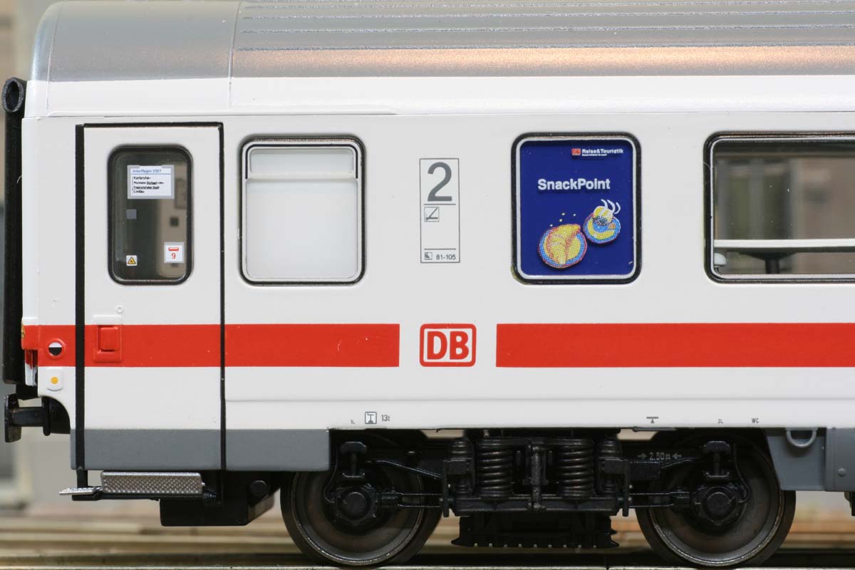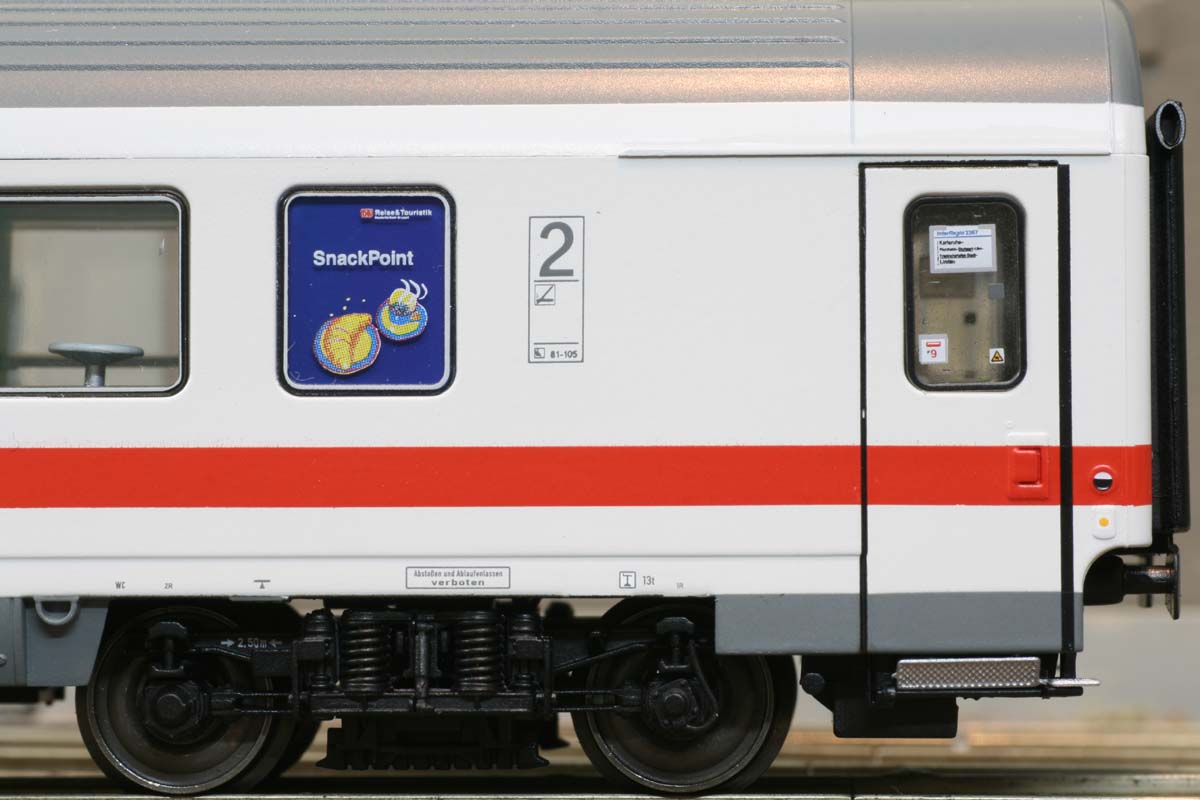 2. Klasse-Großraumwagen, ICE-Farbgebeung, silbernes Dach, DB Reise & Touristik AG, “Snack Point”