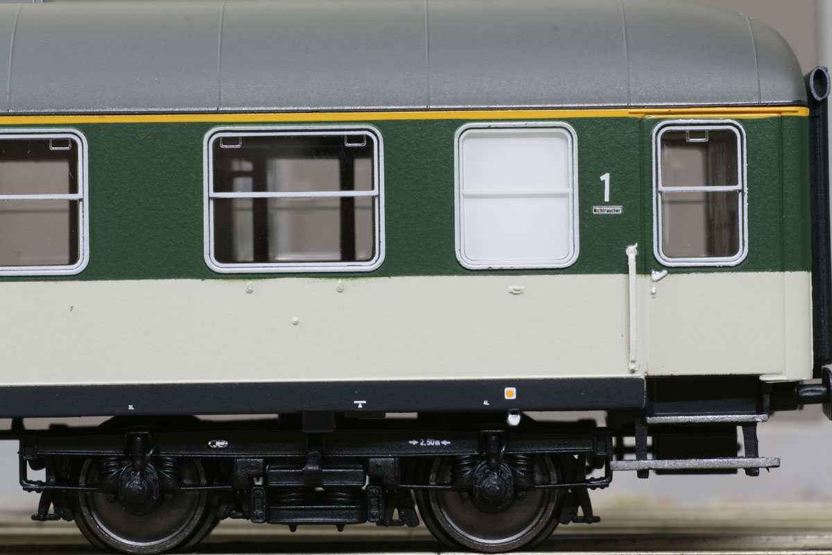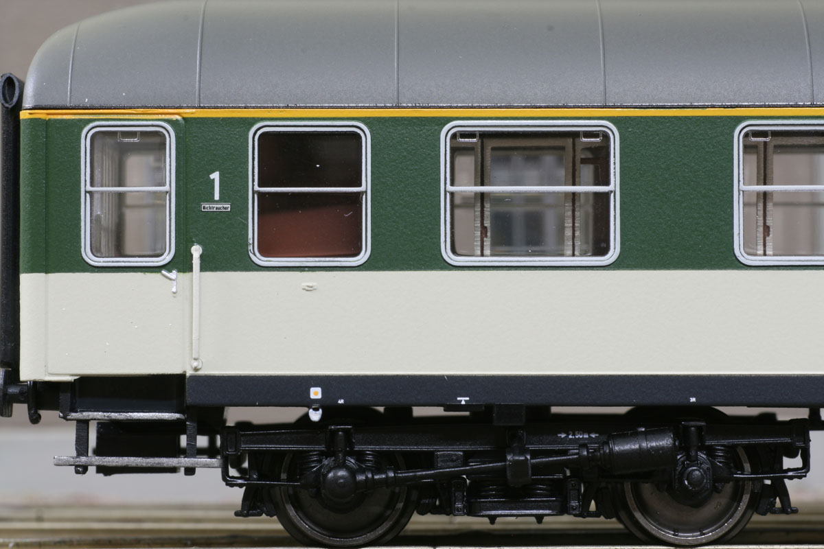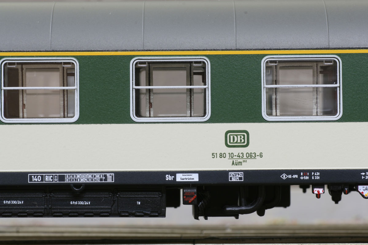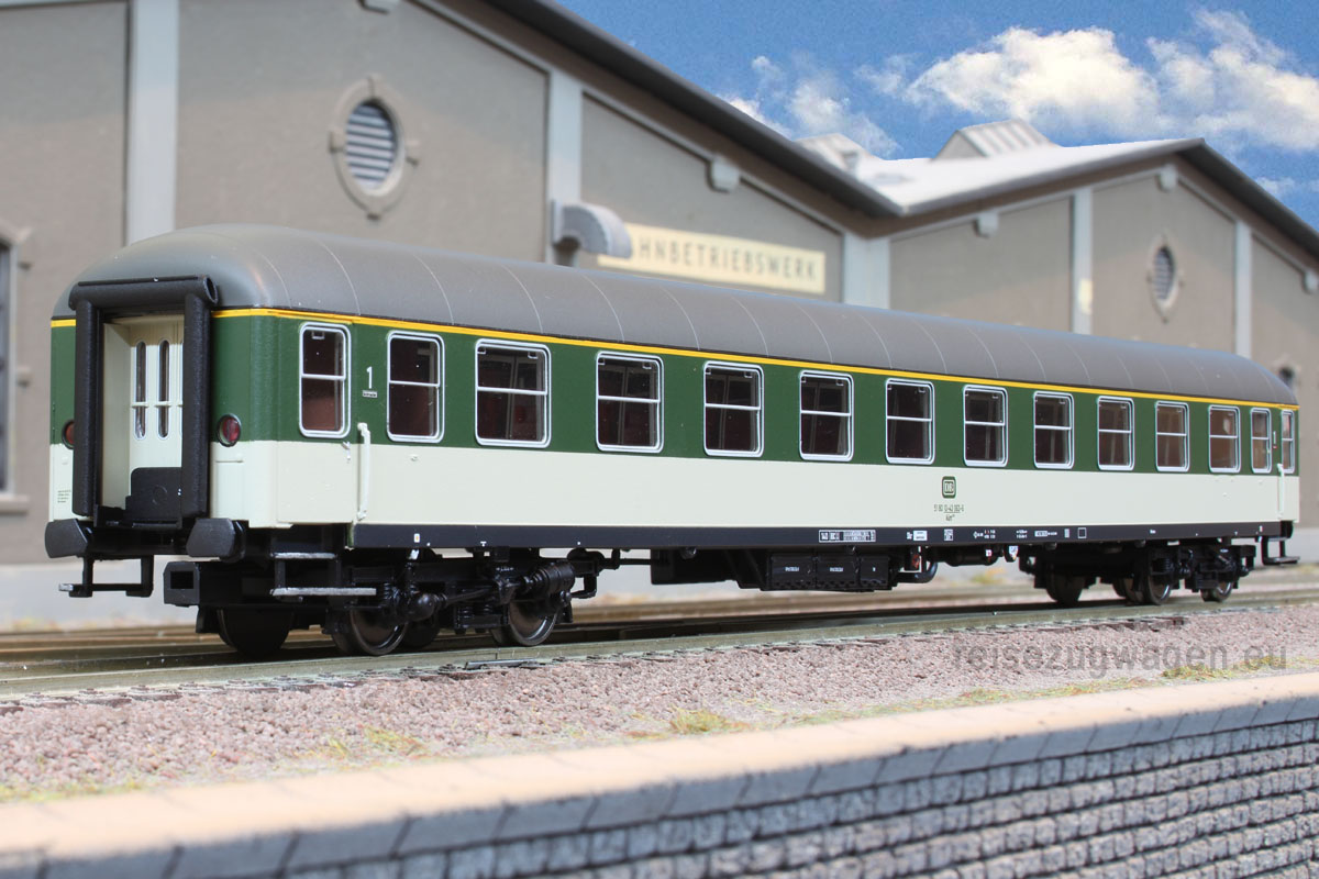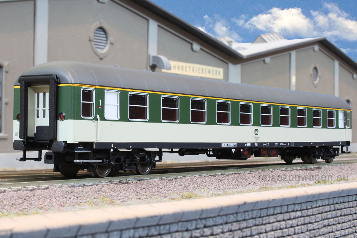 1. Klasse Schnellzugwagen der Bauart Aüm 202 (Gruppe 53) in “pop”-Farben grün/kieselgrau, Ep. IV