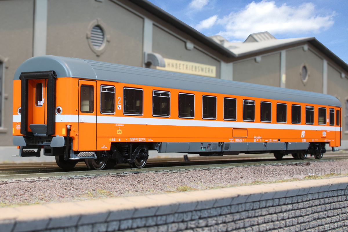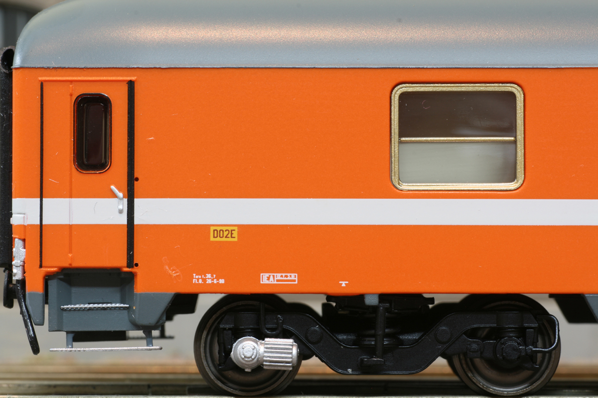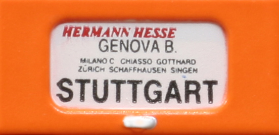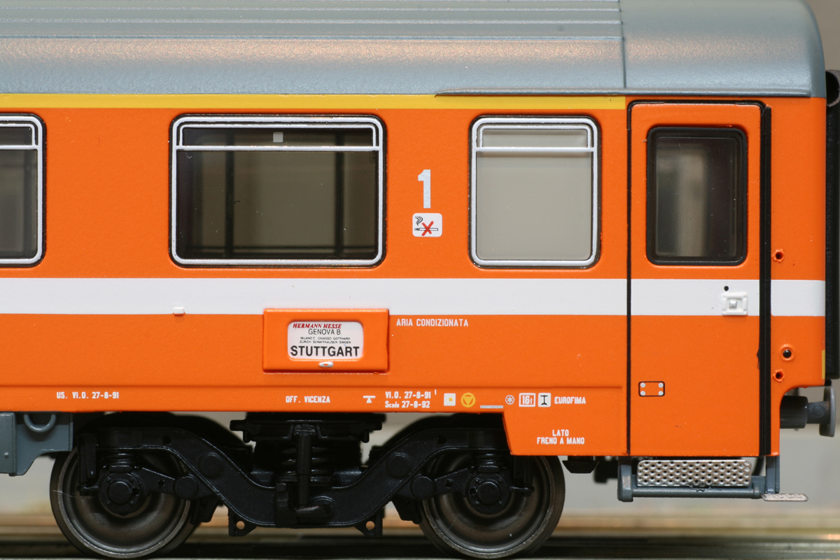 4-tlg. Wagenset D 383 “Hermann Hesse” (Genova B-Milano C-Chiasso-Gotthard-Zürich-Schaffhausen-Singen-Stuttgart) bestehend aus 1x D, 1x A (Eurofima), 2x B (Eurofima), alle Wagen mit schrägen Logo. Einmalige Sonderserie für reisezugwagen.eu