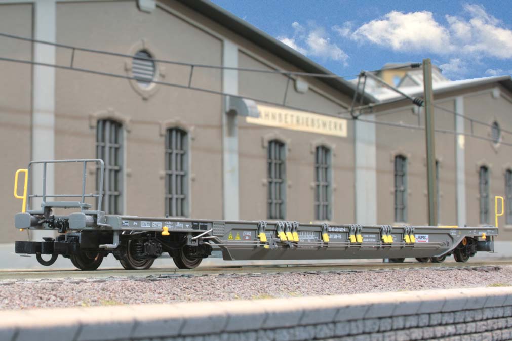 4-achsiger Tragwagen der “Hupac”, unbeladen. Mischbauweise aus Kunststoff und Metall, Radsätze nach NEM 311.1, Normschacht mit Kulissenführung. (Abb zeigt ähnl. Modell), Ep. VI