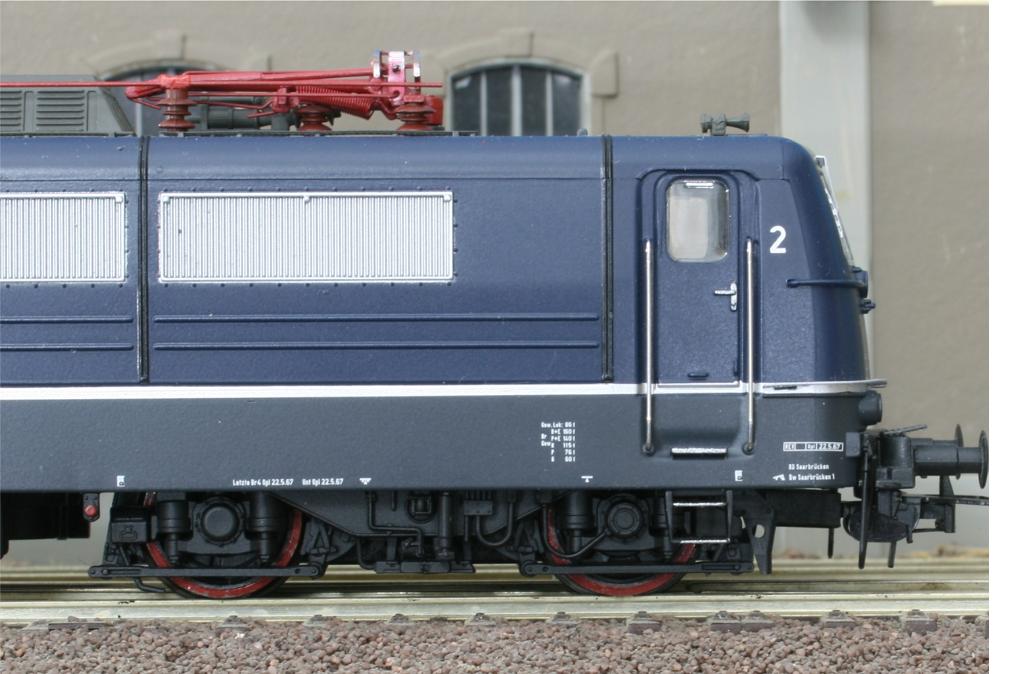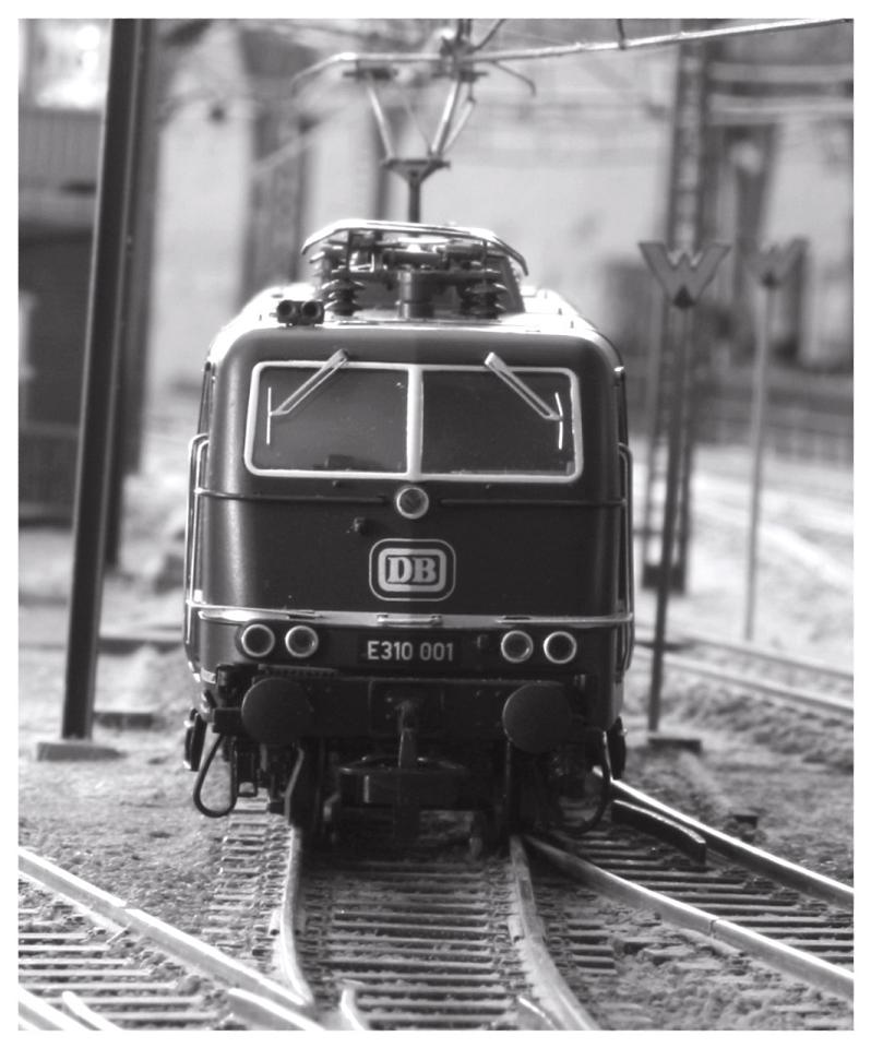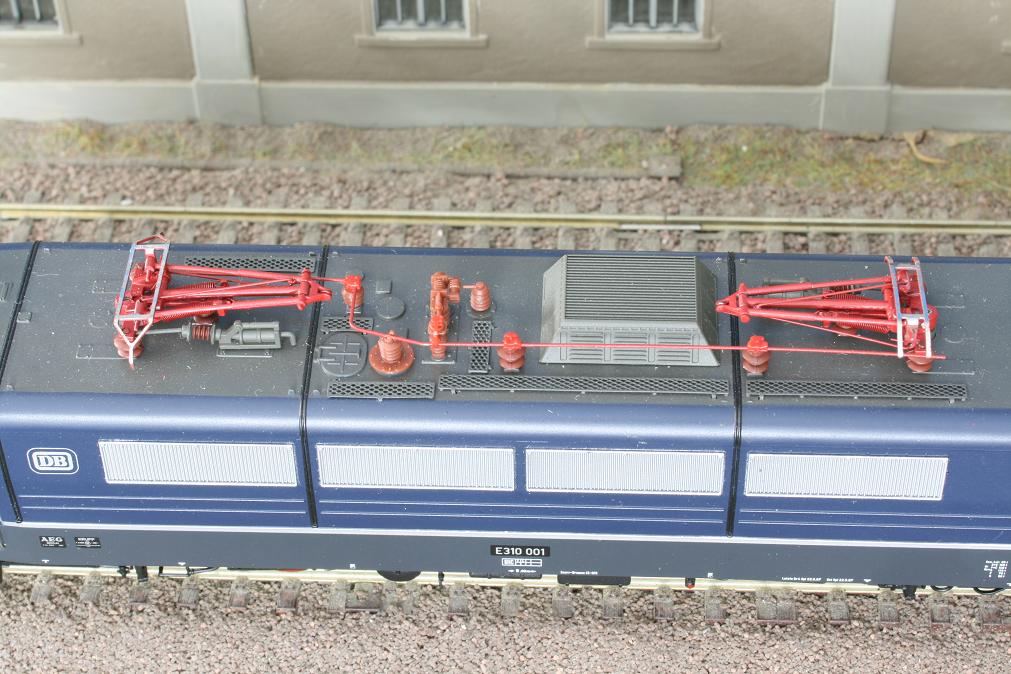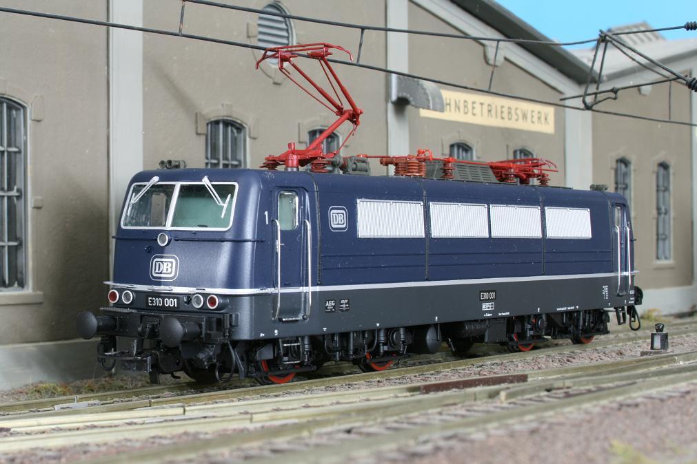 Modell einer Mehrsystem-Lokomotive der Baureihe E 310 ( “Europalok” ). Die Maschine besitzt 2 Stromabnehmer, die Dachtritte sind durchbrochen. Die Lackierung und Beschriftung entspricht der Ep. III