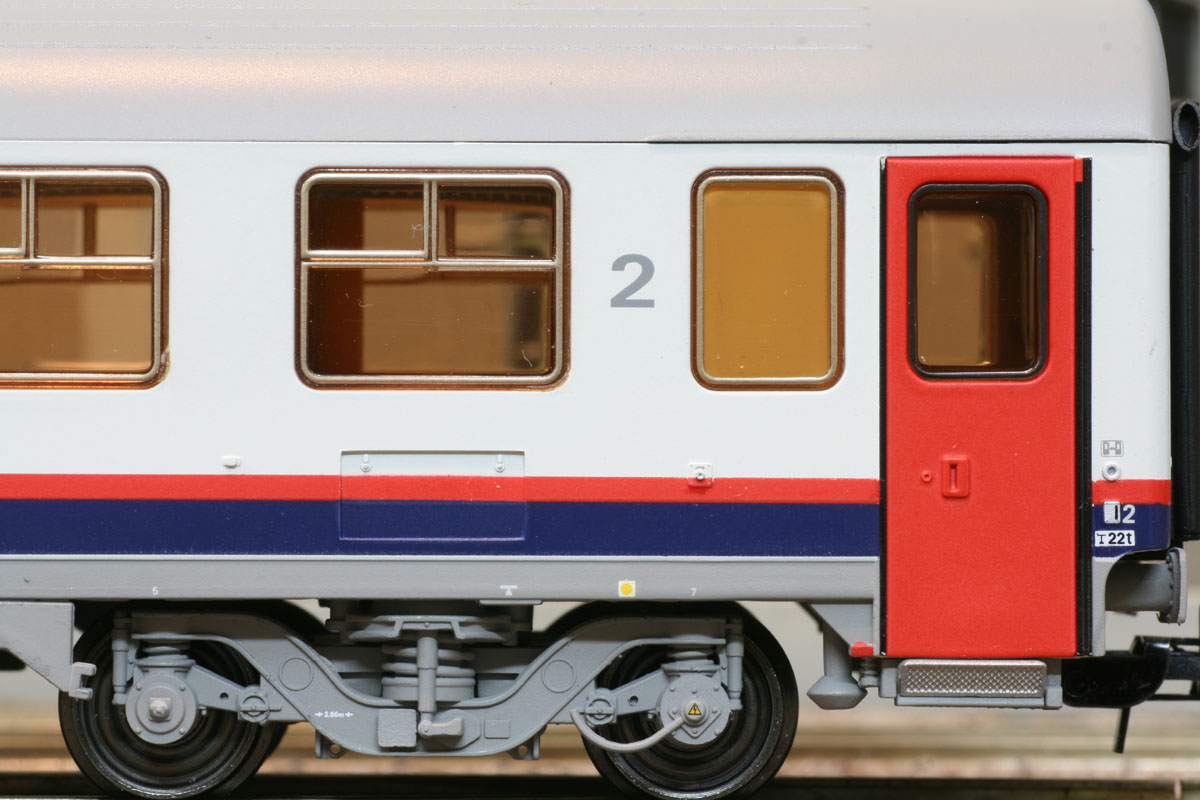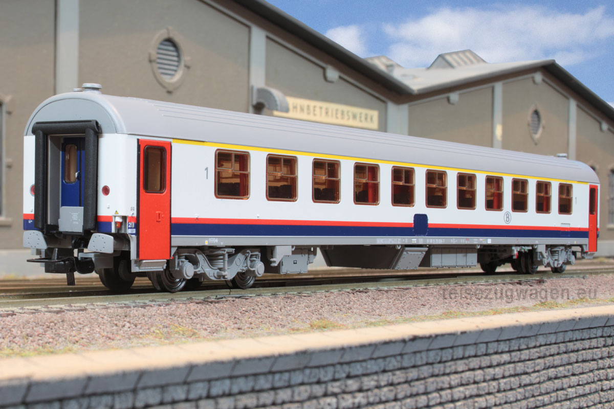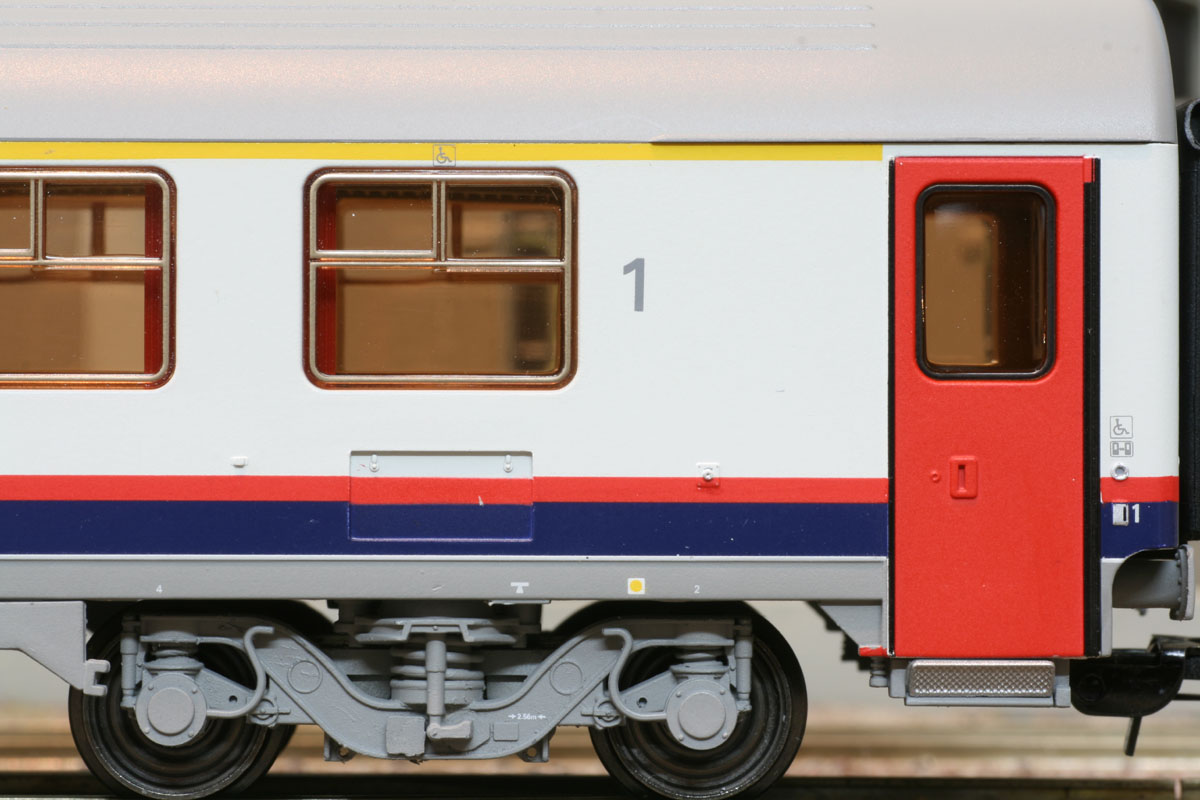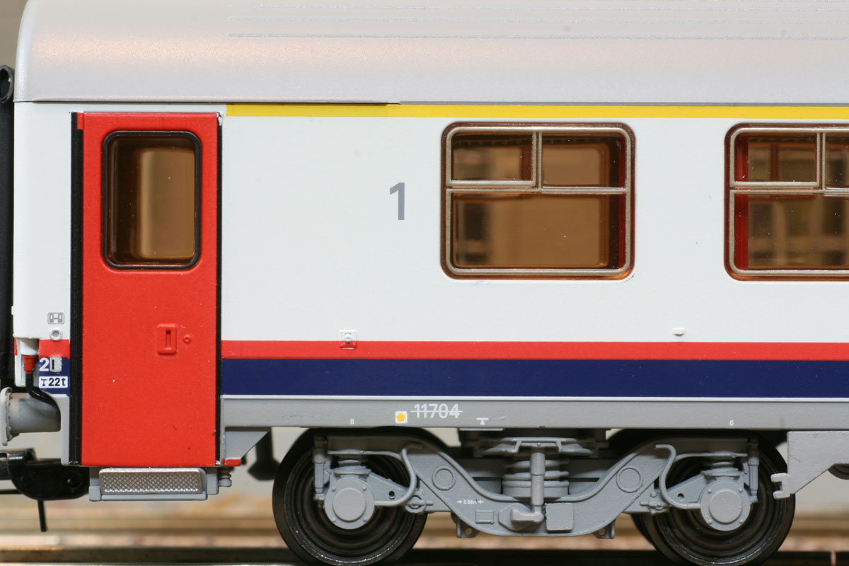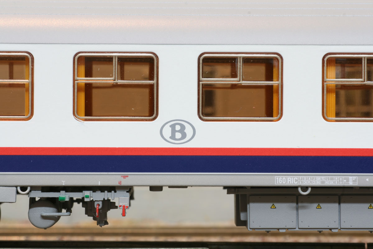 3-tlg. Wagen- Set I 10 der SNCB bestehend aus 1x 1. Klasse (Großraum) und 2x 2. Klasse (Großraum) mit ursprünglichen Fenster (unklimatisiert). Die Lackierung und Beschriftung entspricht der Ep V (ca. 2005)