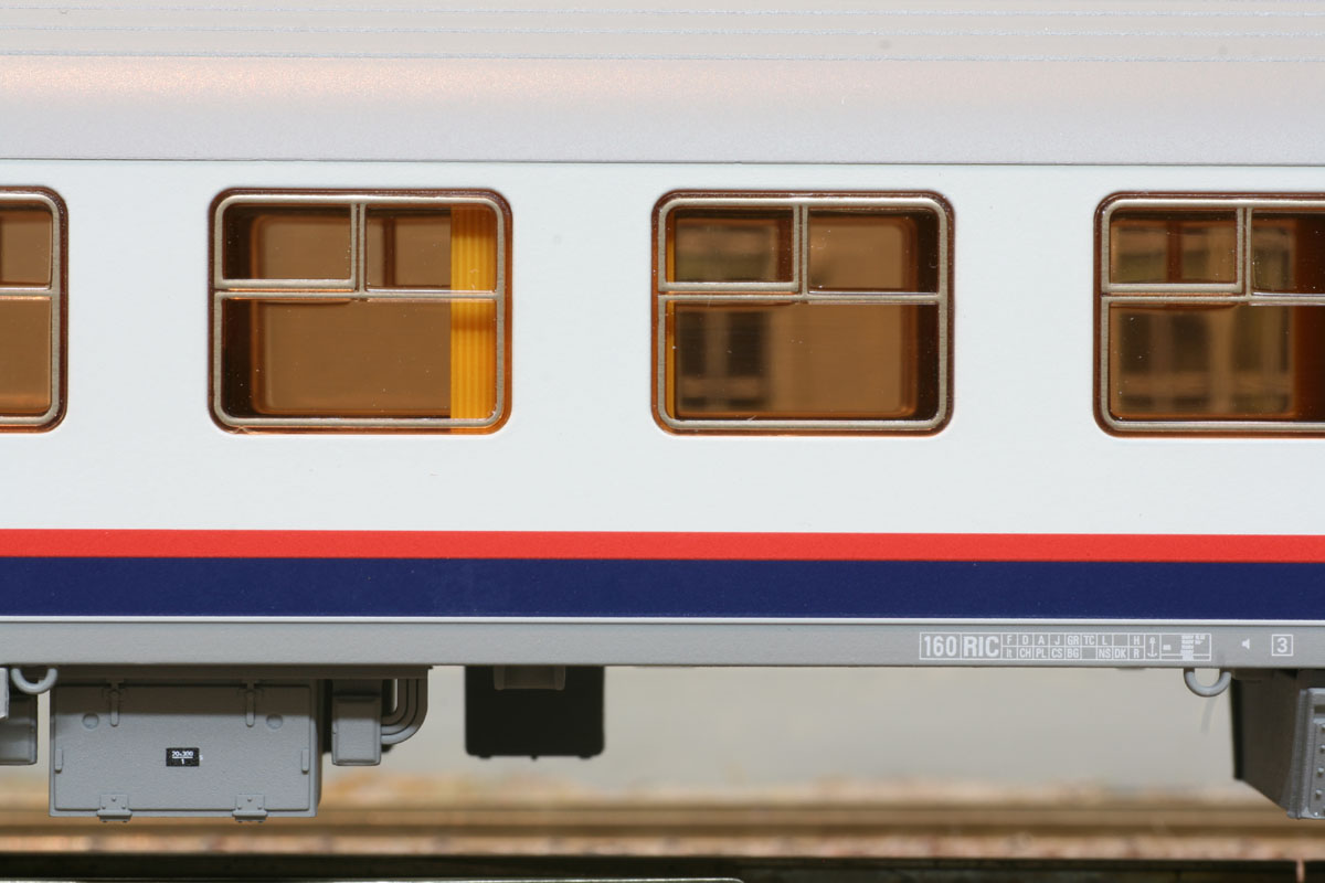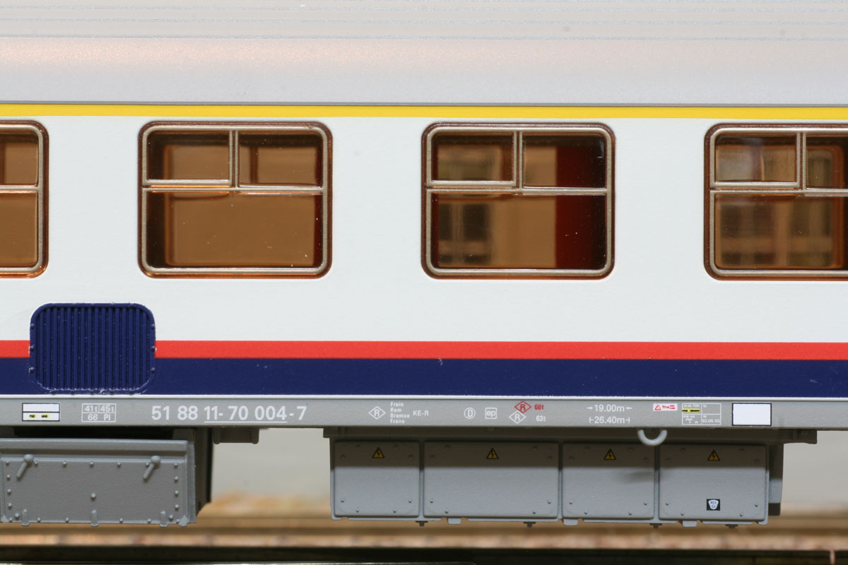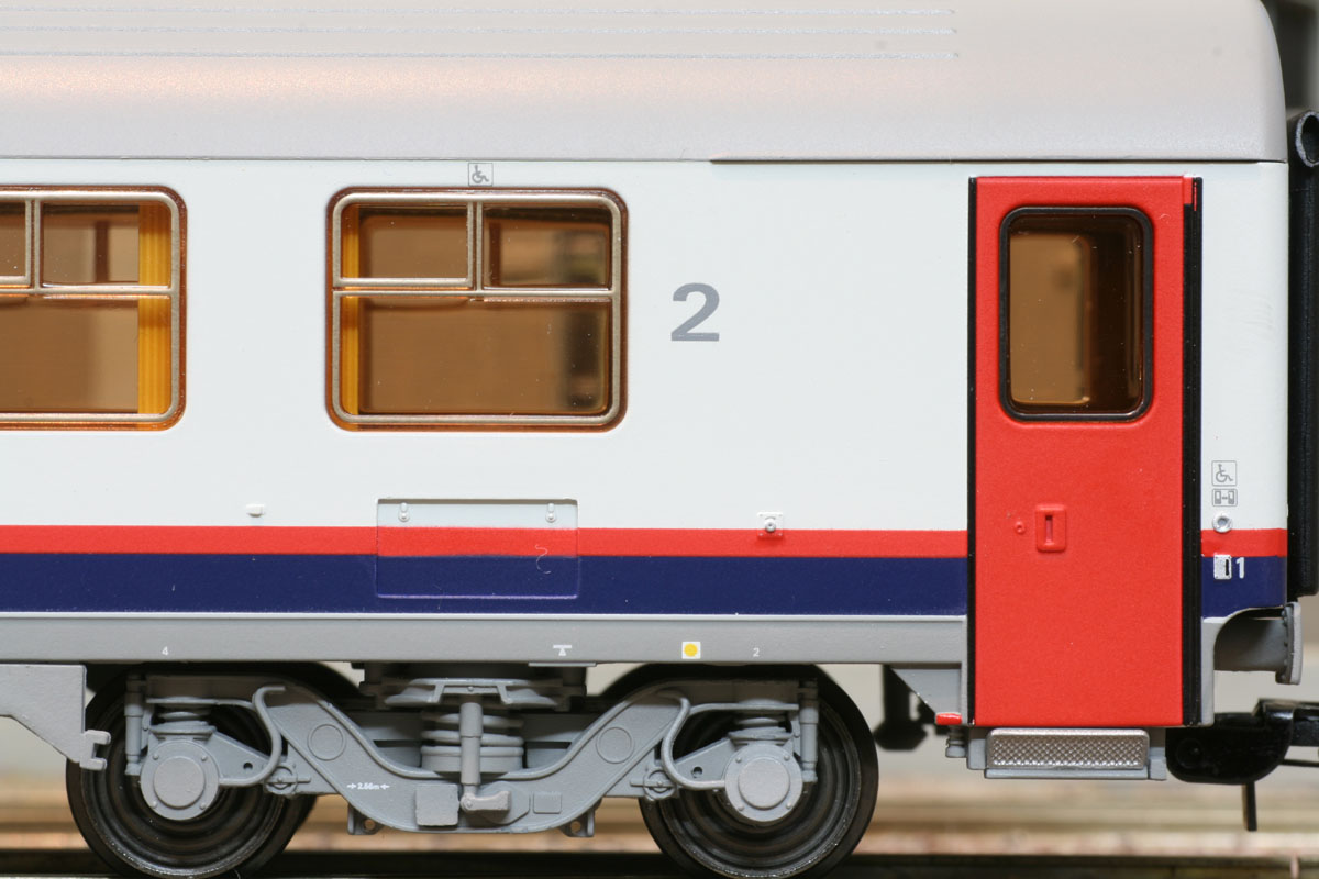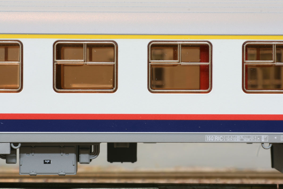 3-tlg. Wagen- Set I 10 der SNCB bestehend aus 1x 1. Klasse (Großraum) und 2x 2. Klasse (Großraum) mit ursprünglichen Fenster (unklimatisiert). Die Lackierung und Beschriftung entspricht der Ep V (ca. 2005)