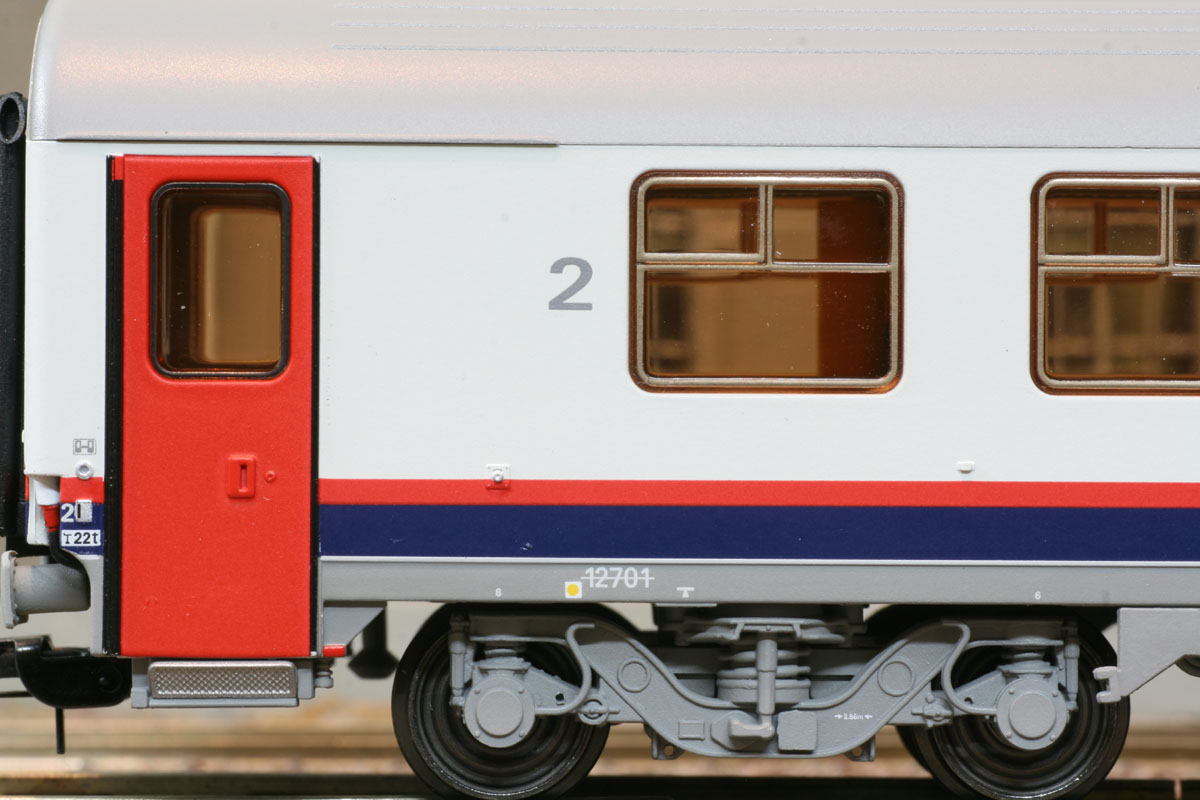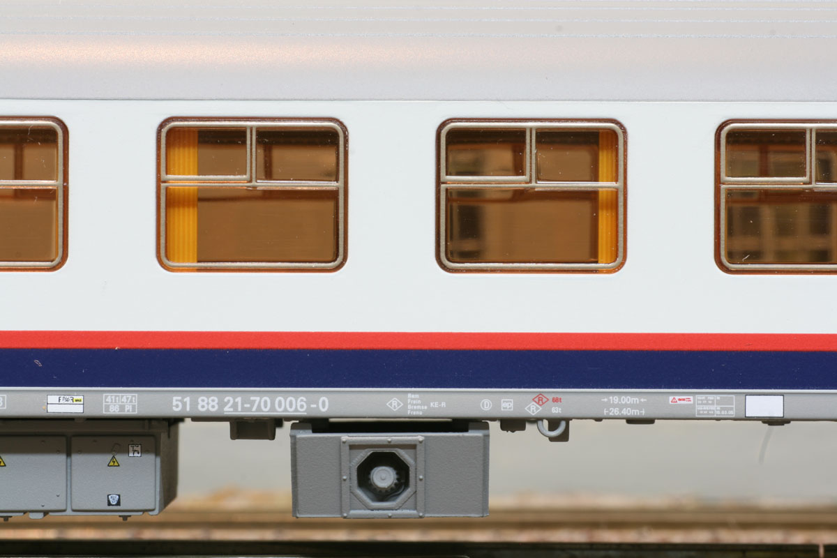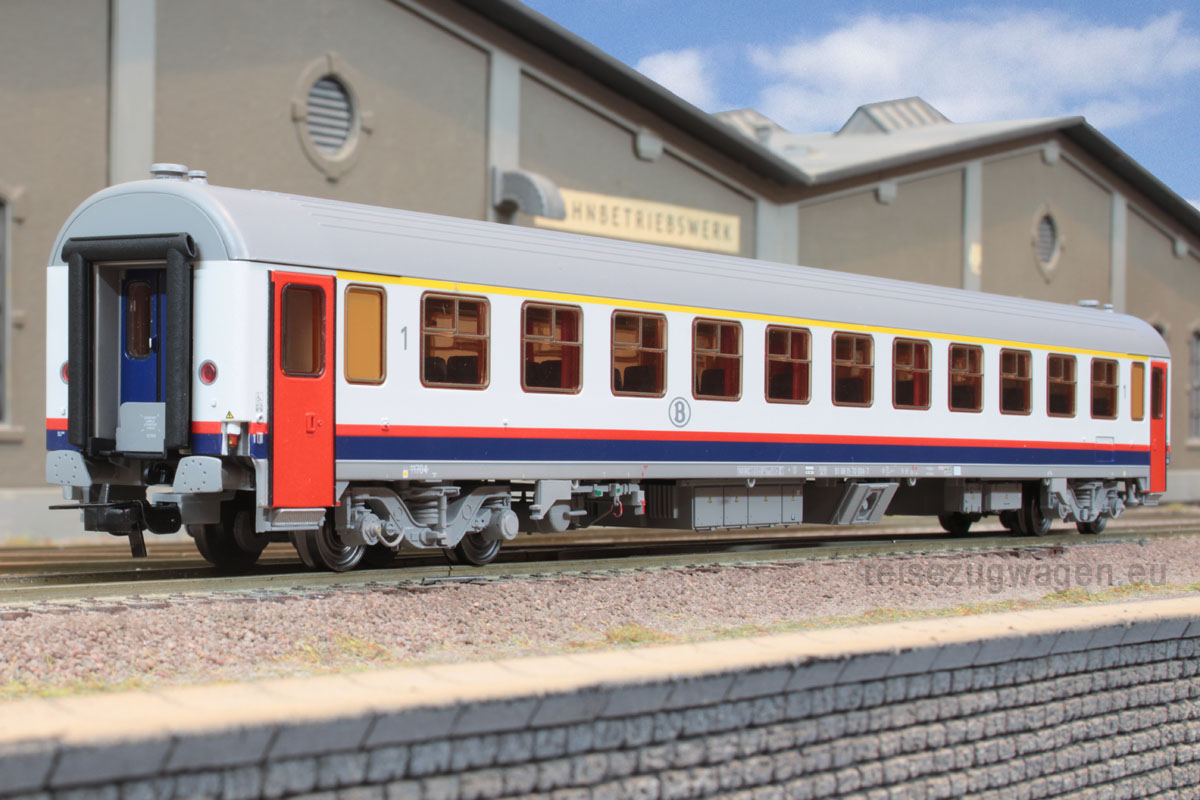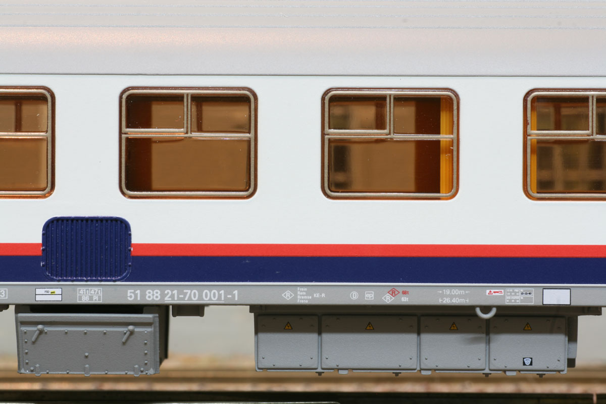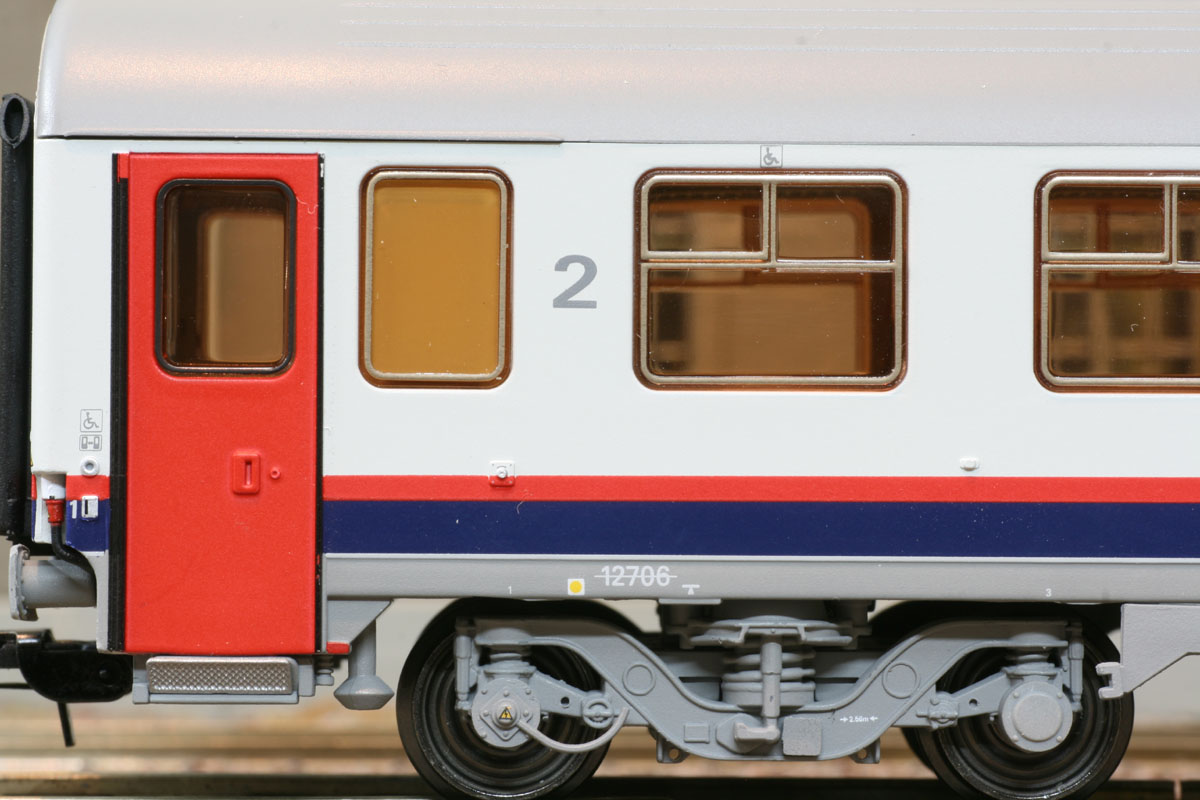 3-tlg. Wagen- Set I 10 der SNCB bestehend aus 1x 1. Klasse (Großraum) und 2x 2. Klasse (Großraum) mit ursprünglichen Fenster (unklimatisiert). Die Lackierung und Beschriftung entspricht der Ep V (ca. 2005)
