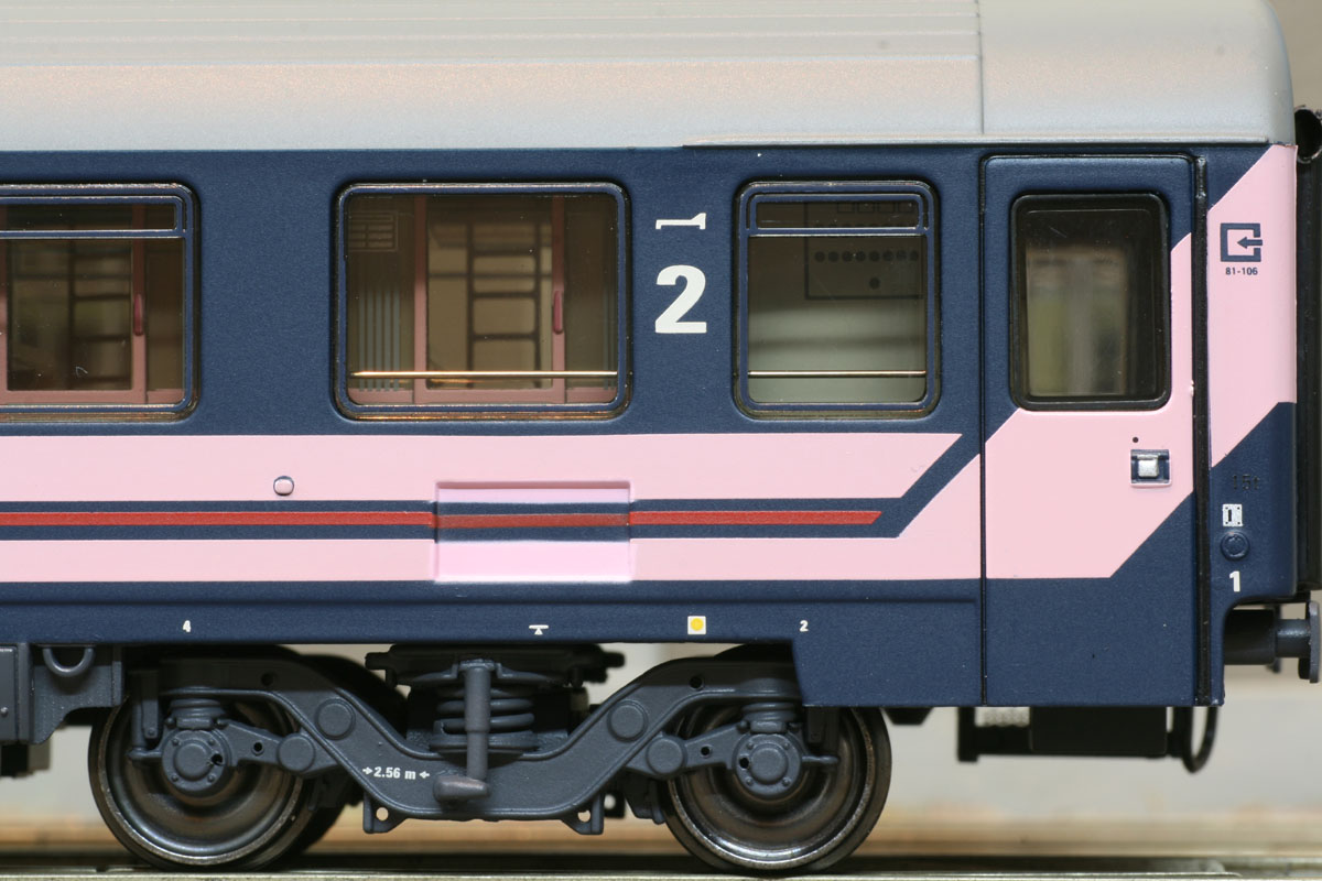 Liegewagen Typ Bc “Eurofima” der SNCB, großes Logo Logo, dunkler rosa Streifen, blaue Fensterrahmen, Ep. V