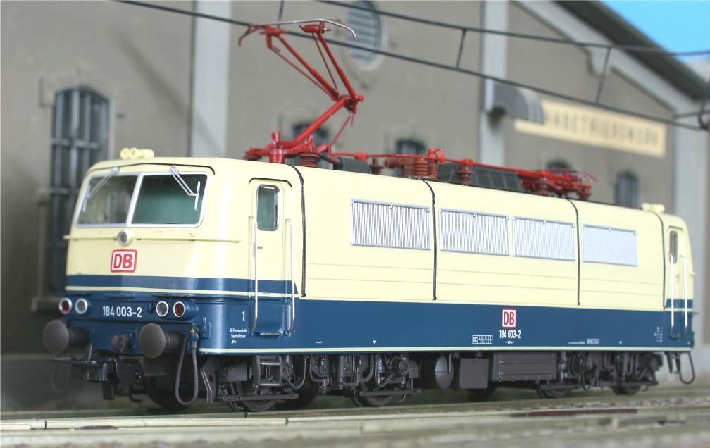 Modell einer Mehrsystem-Lokomotive der Baureihe 184 ( “Europalok” ). Die Maschine besitzt 2 Stromabnehmer, die Dachtritte sind durchbrochen. Die Lackierung und Beschriftung entspricht der Ep. IV/V
