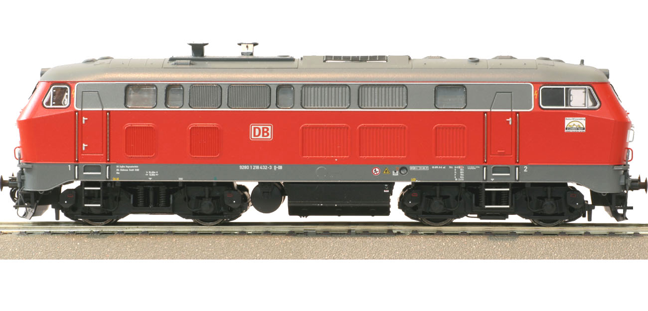 Diesellokomotive der Baureihe 218.4 (218 432-3). MTU-4000 Motor, diagonal versetzte Abgashutzen, silberne Fensterrahmen, REV 31.05.2017. “3-Löwen-Takt”. Die Vorbildlokomotive ist technisch mit 218 425-7 kompatibel. Beide Modelle eignen sich hervorragend zur Bespannung des IC 118