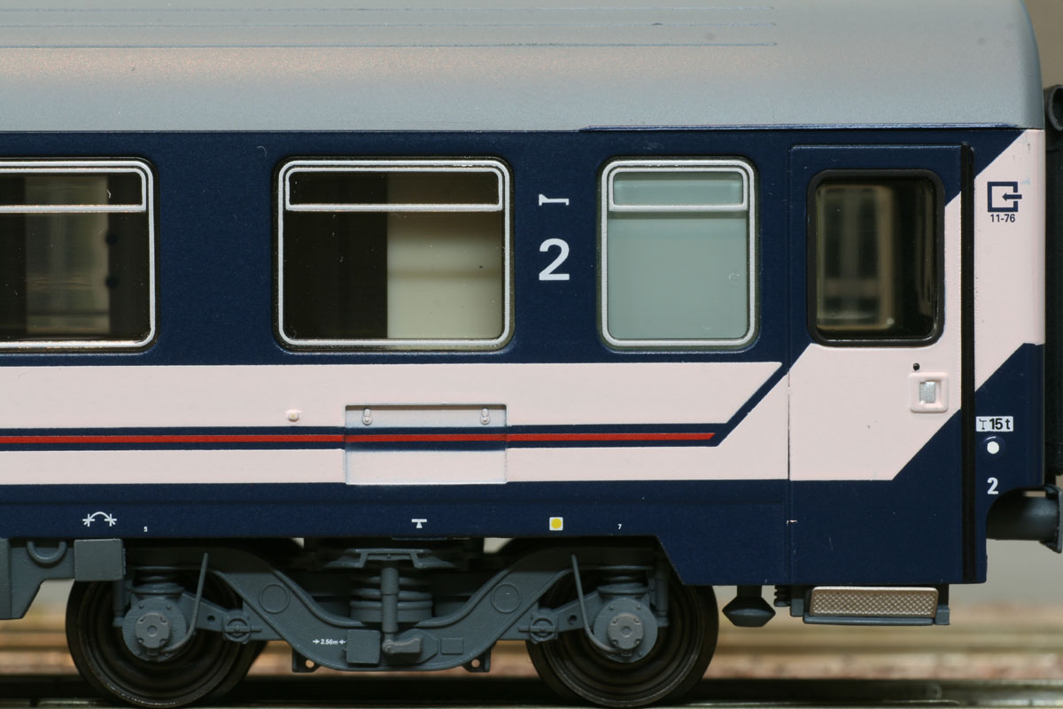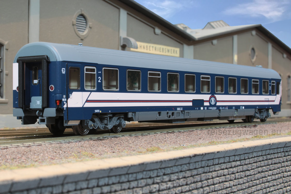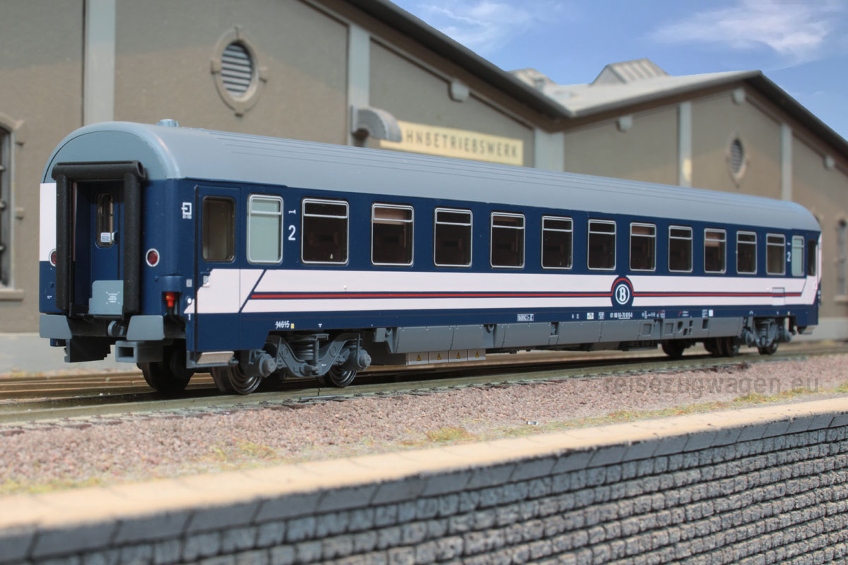 Liegewagen Typ Eurofima der SNCB blau mit rosa Streifen (hell), kleine Logo, Tagesstellung, 3 Dachlüfter Ep V-VI