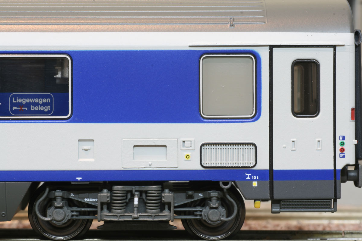 Liegewagen der Bauart Bcmz 59-91.1 mit MD 52- Drehgestellen, ultramarinblau/achatgrau, “Pflatsch”- Logo, Ep V