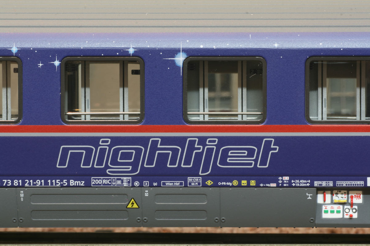 3-tlg. Schlaf-/Liegewagenset “NightJet” der ÖBB bestehend aus 1x WLABmz und 2x Sitzwagen Bmz 21-91.1, Ep VI