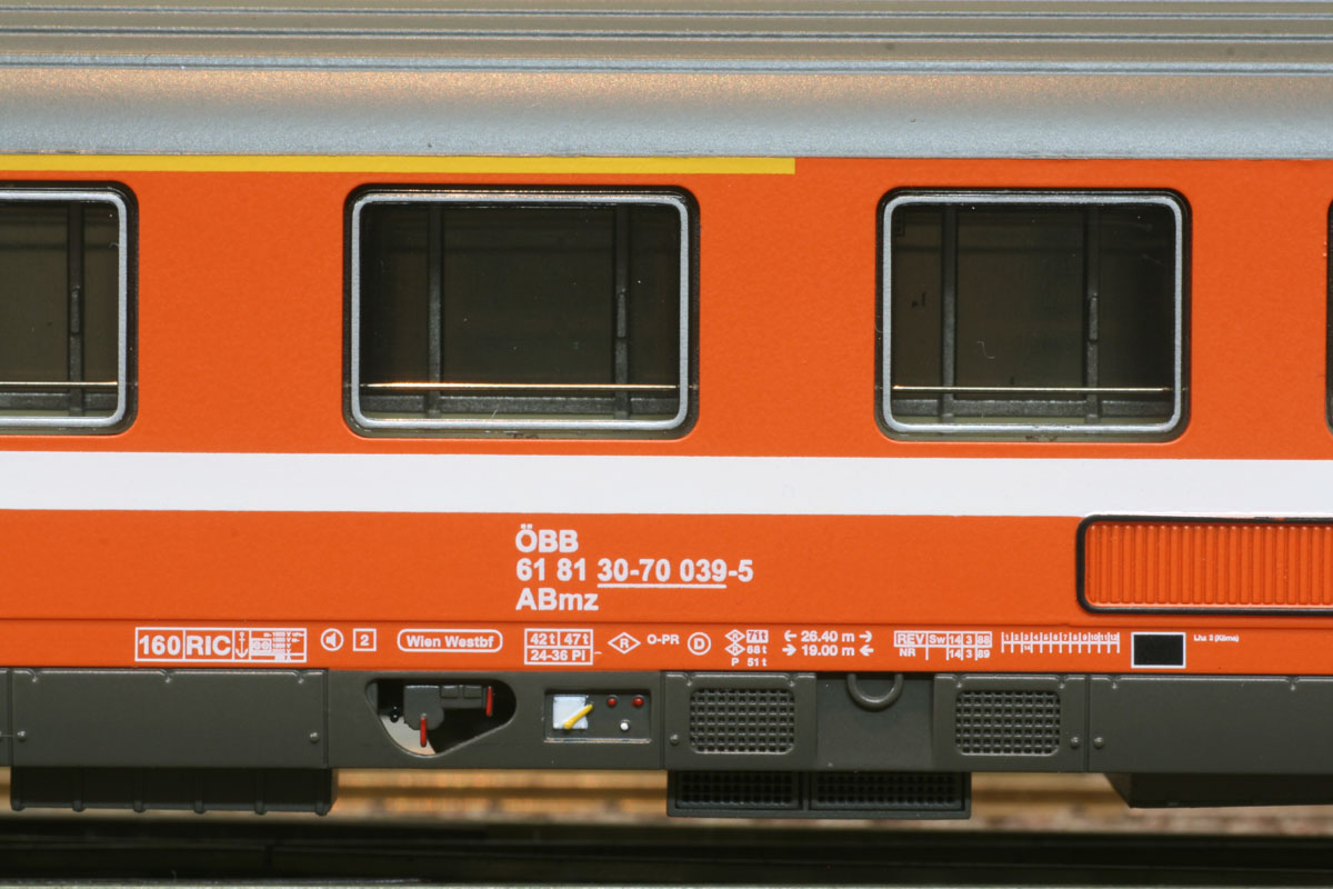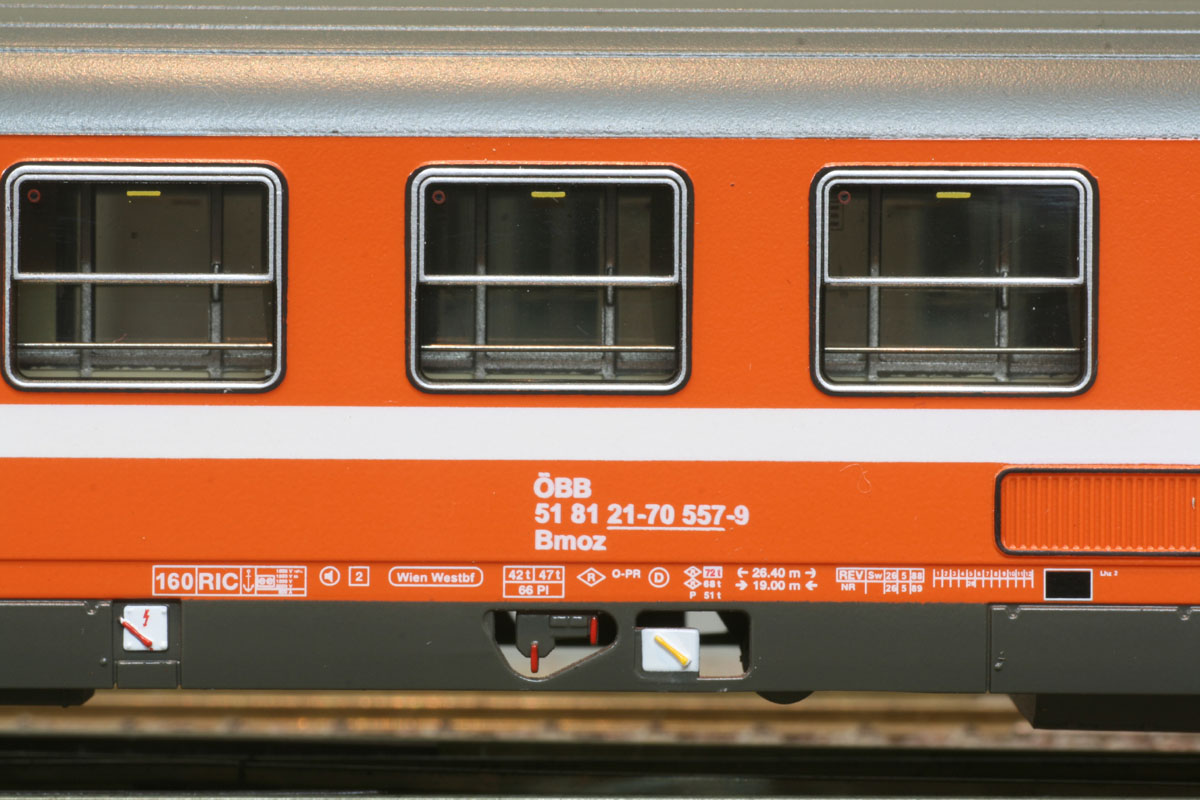 4-tlg. Wagenset bestehend aus 2x Bmz, 1x ABmz und 1x WLABmz (Typ MU) der ÖBB, C1- Lackierung, Ep IV