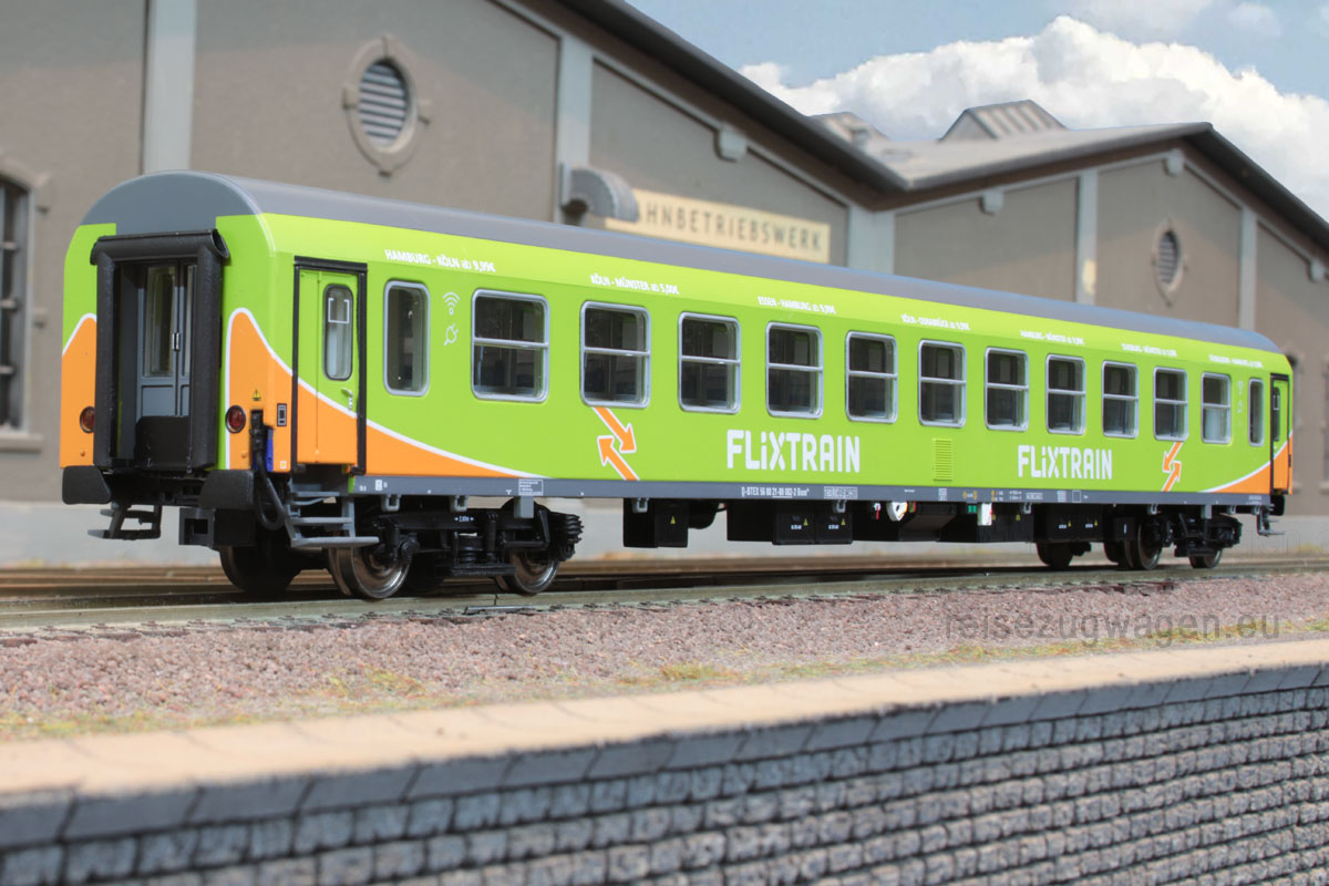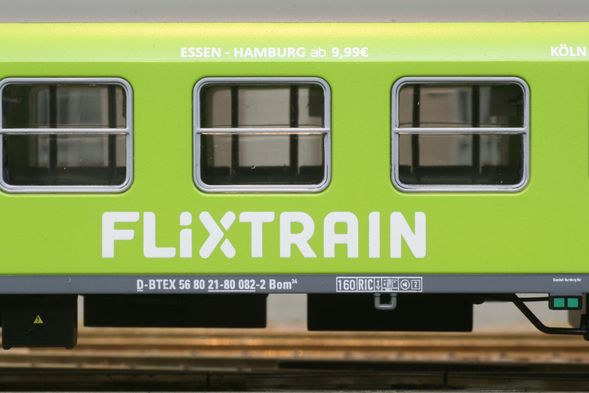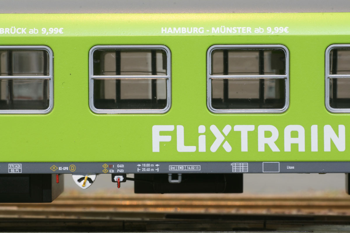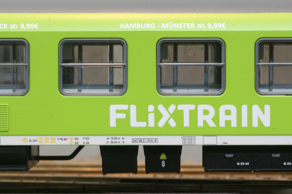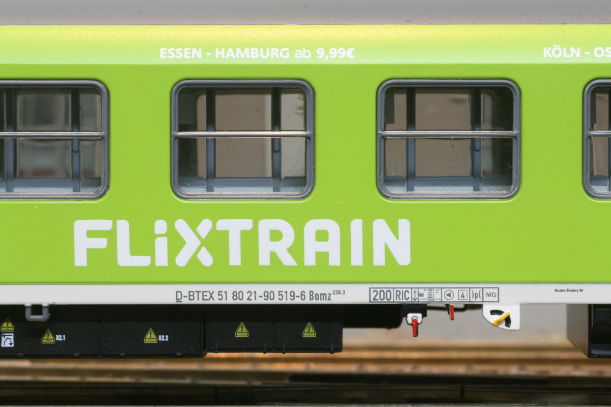 3-tlg. Wagen “FLIXTRAIN” bestehend aus 1x Bom 24 (grün), 1x Bomdz 236.3 (grün) und 1x Bomdz 236.9 (ex CNL rot), Ep VI