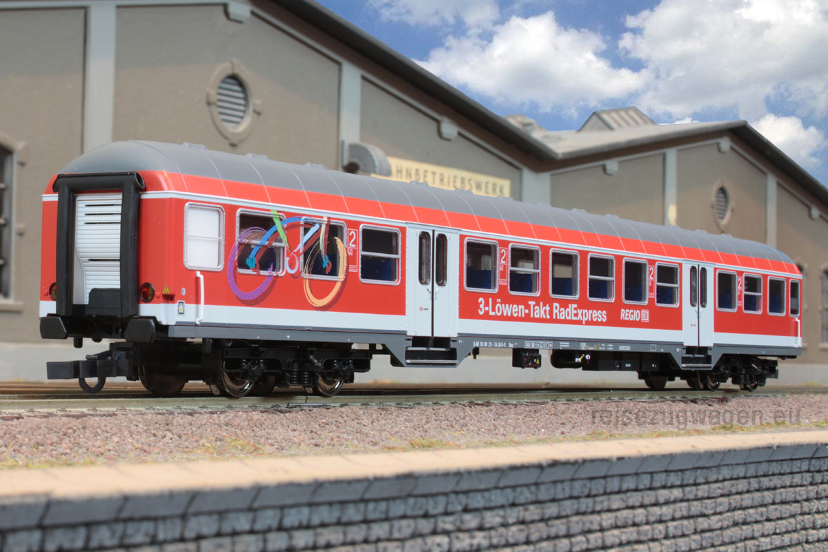 3- tlg. Wagenset “3- Löwen- Takt RadExpress” bestehend aus 1x Dduu 498.1 und 2x Bnrz 451.4. 218 432-3 (73761) ist die vorbildgerechte Lok für diese Garnitur. Ep VI