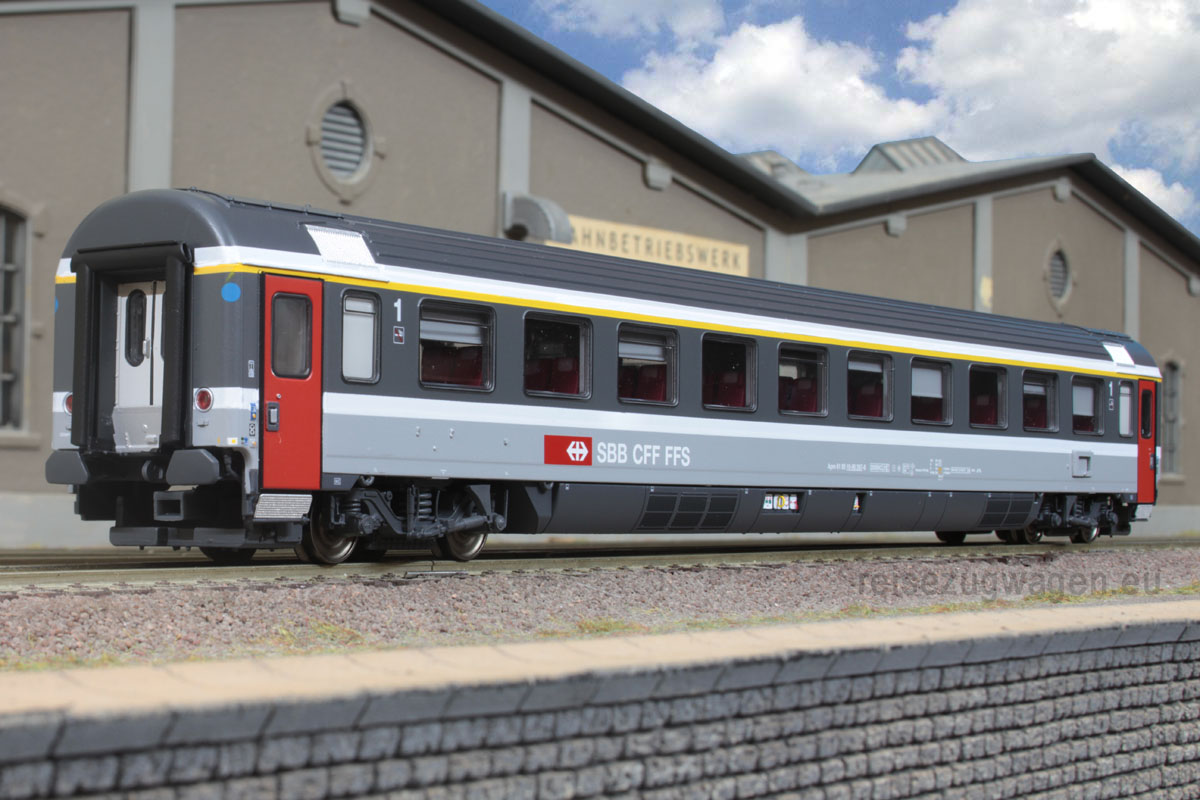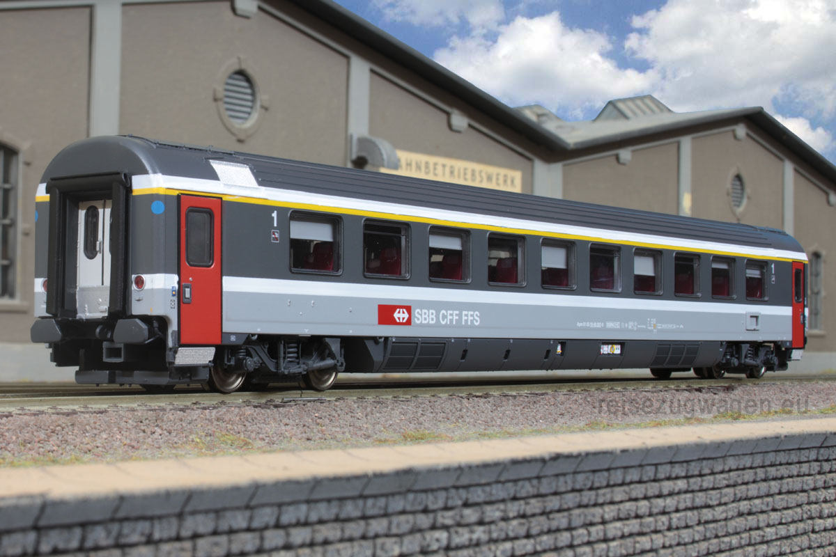 1. Klasse Großraumwagen des Typs Bpm (EC) der SBB, graue Lackierung, Vakuum- WC, Ep V-VI