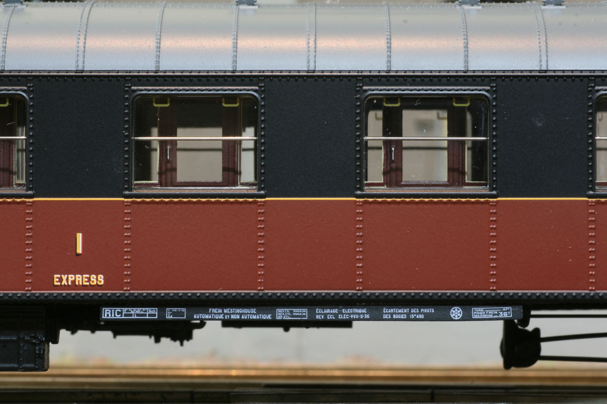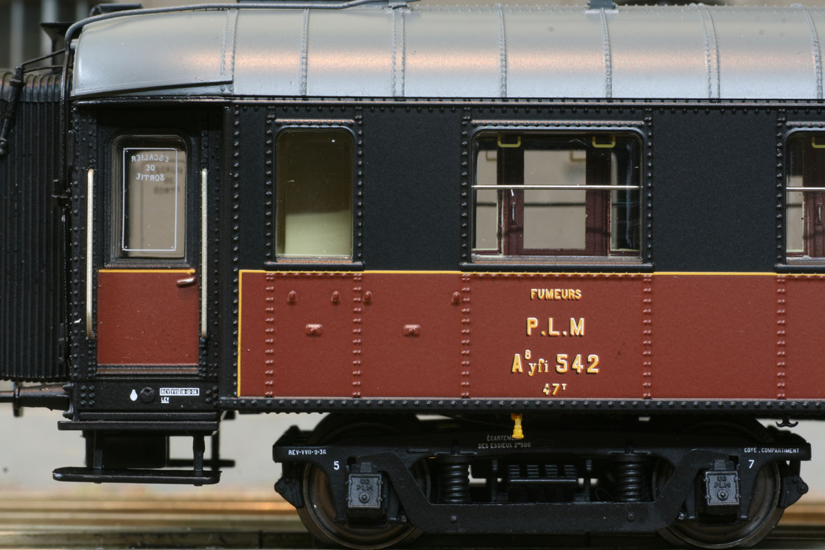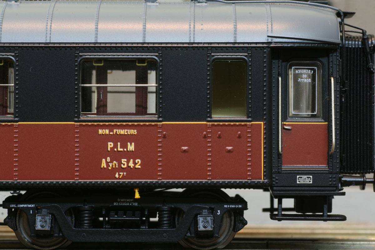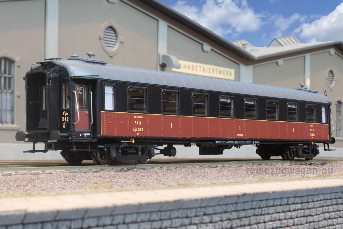 A8yfi 1. Klasse Abteilwagen (Typ OCEM RA). Rotbraune Lackierung (brun van Dyck), Drehgestelle M1, P.L.M. Ep IIb