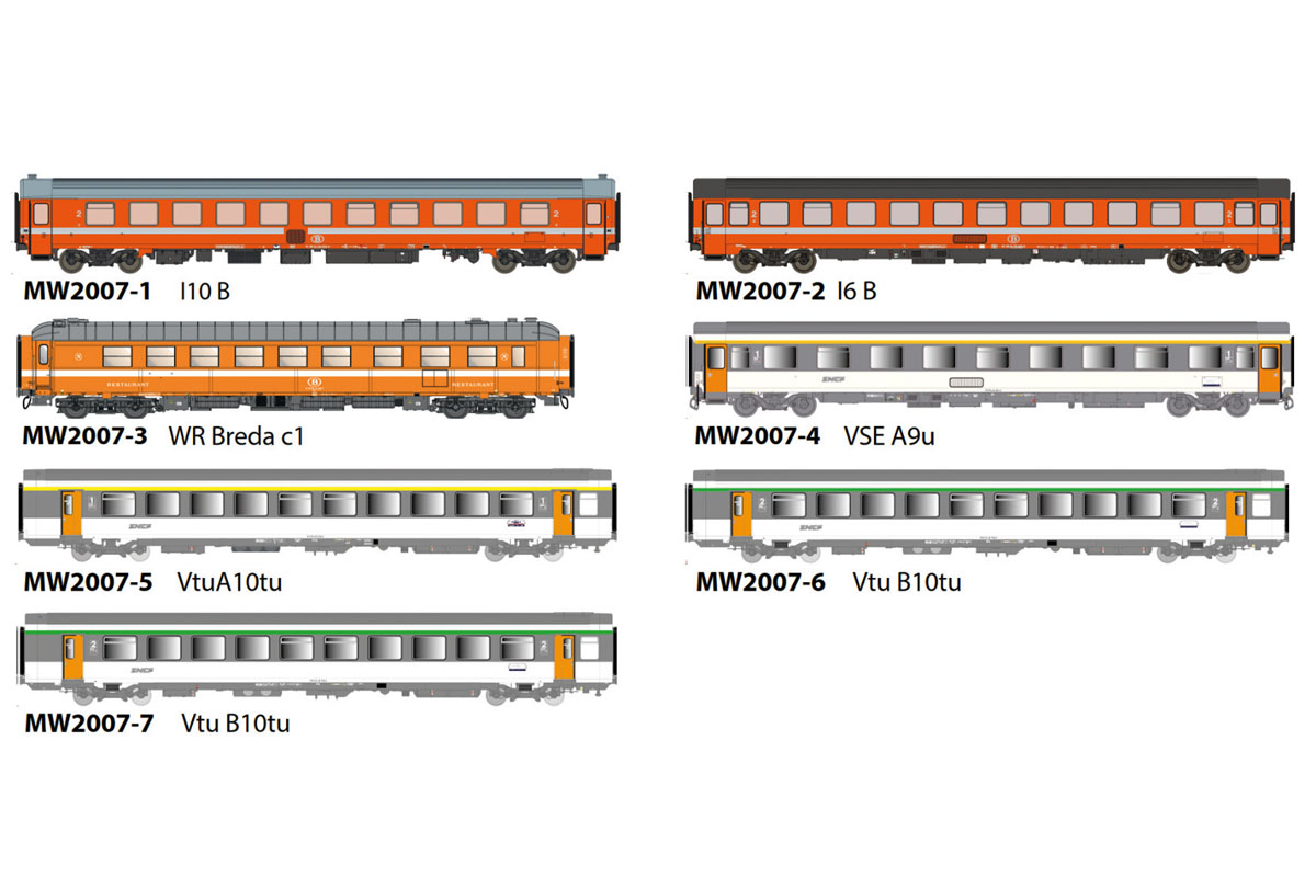 7-tlg. Wagenset EC Milan- Bruxells Midi bestehend aus : 1x B (Typ I10 der SNCB), 1x B (Typ Eurofima der SNCB), 1x WR (Typ Breda), 1x A9 (Typ Eurofima der SNCF), 1x A10 (Typ Corail der SNCF) und 2x B10 (Typ Corail der SNCF). Ep IV-V