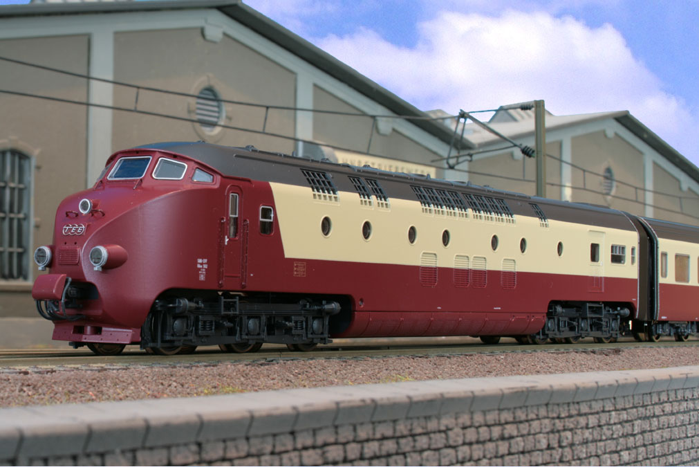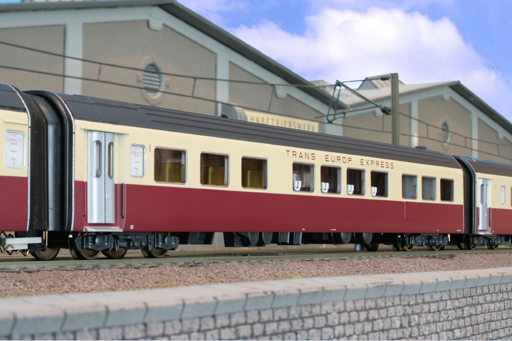 4-teiliges TEE-Set “Arbalete”, bestehend aus je einem Motor-, Speise-, Abteil- und Steuerwagen. Neu, unbespielt, nicht zugerüstet ( verschlossener Beutel liegt dem Modell bei ), OVP