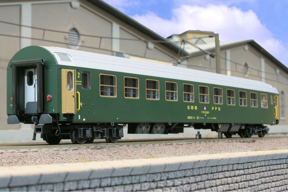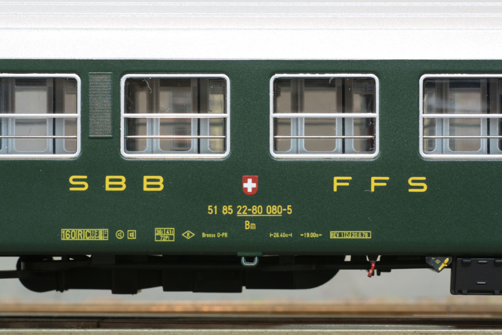 3-teiliges Set RIC-Wagen bestehend aus 2 Sitzwagen 2. Klasse Bm 11 / Bm 12 (silbernes Dach, altes Logo) und 1 RIC-Dms (silbernes Dach, altes Logo).