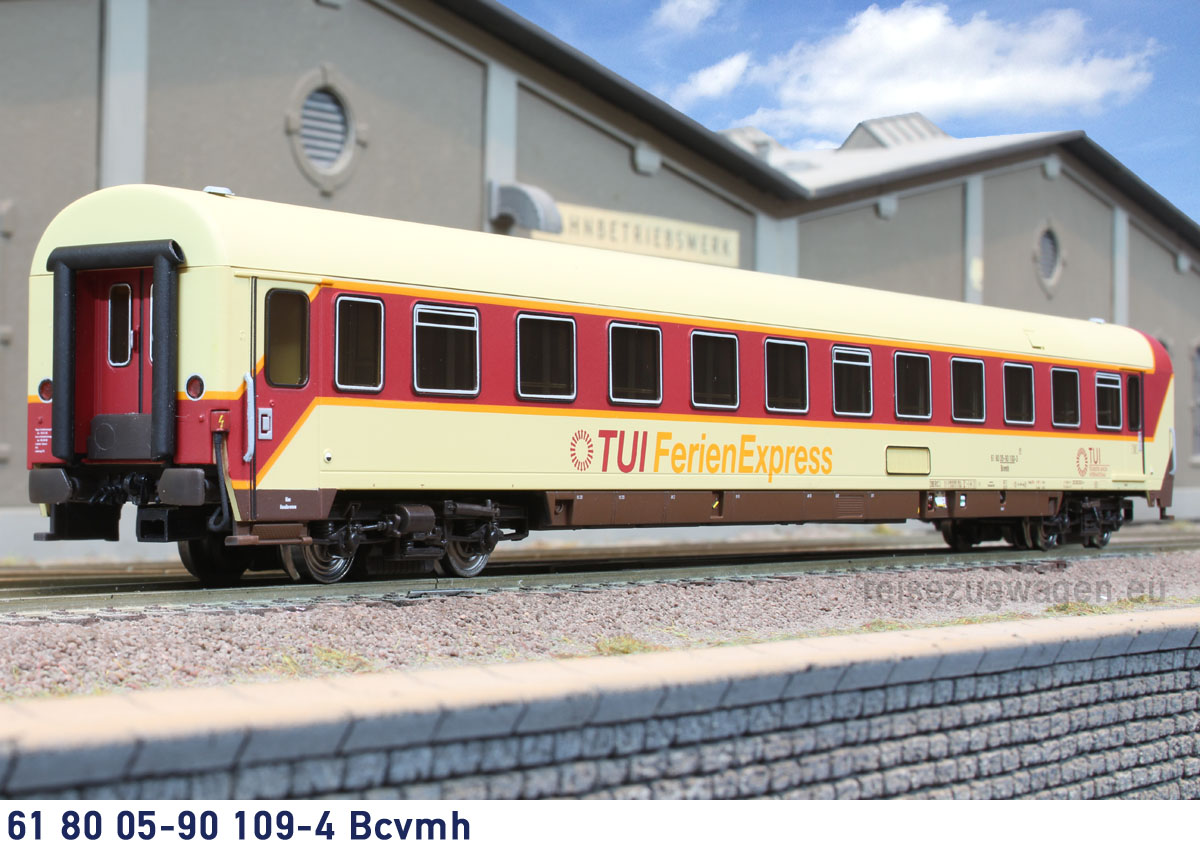 4-teiliges TUI-Wagenset bestehend aus 3 Liegewagen Bcvmh ( 2 x 70er, 1 x 90er, neue Nummern ) mit ursprünglichem Logo und einem Speisewagen der Bauart WRtm 134 (”Alpen-See-Express “). Einmalige Sonderserie für reisezugwagen.eu