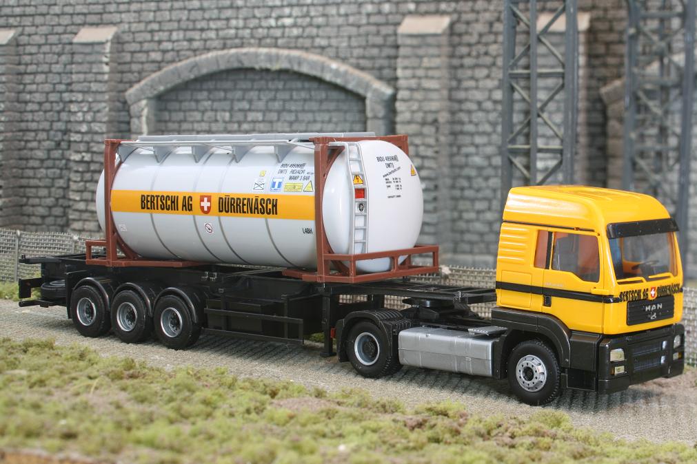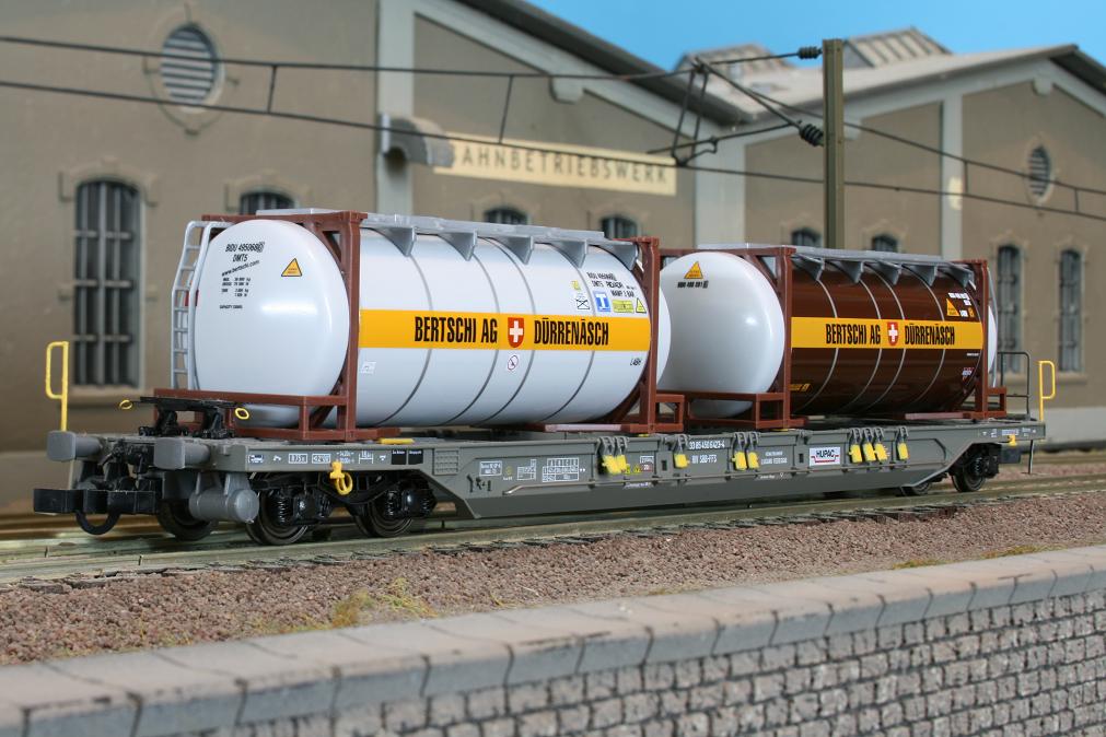 4-achsiger Tragwagen der “Hupacâ€, beladen mit 2 “Bertschi”-Wechselbehälter und einem MAN TG-A LX mit Wechselpritsche. Mischbauweise aus Kunststoff und Metall, Radsätze nach NEM 311.1, Normschacht mit Kulissenführung. Nicht zugerüstetes Modell.
