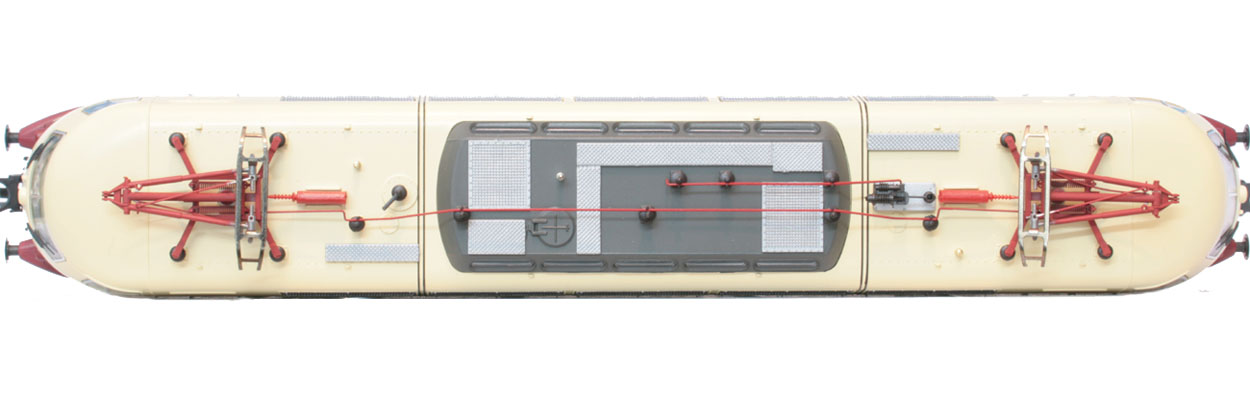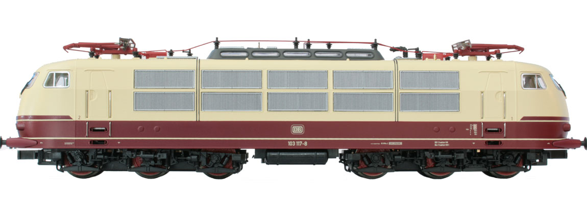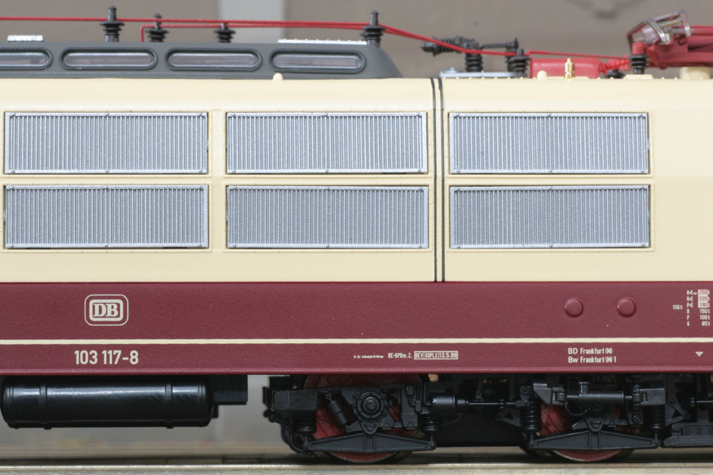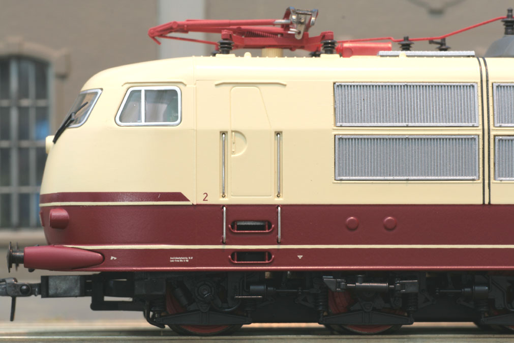 Schnellfahrlokomotive der Baureihe 103, roter Rahmen, Pufferverkleidung, rote DB-Kekse entsprechend der Ep. IVb/V