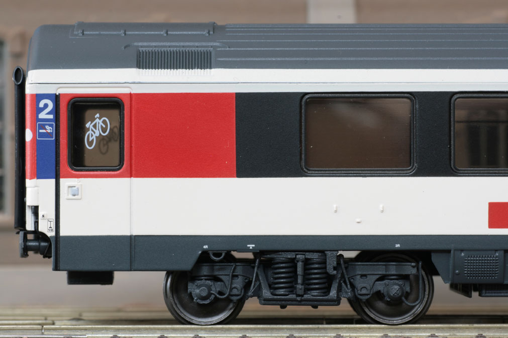 2. Klasse Grossraumwagen Typ Bpm 500 der SBB, langer roter Streifen, Ep. V